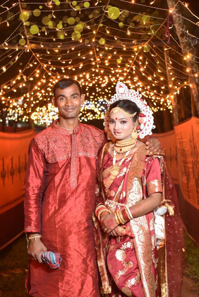বর অমিতের পরনে ছিল লাল রঙের জরি-কাজ করা পাঞ্জাবি। মাথার টোপর তাঁকে এনে দিয়েছিল পরিপূর্ণ বাঙালি বরের আভিজাত্য। তাঁর মুখের শান্ত-গম্ভীর ভাব কনের হাসির সাথে তৈরি করেছিল এক দারুণ সামঞ্জস্য।