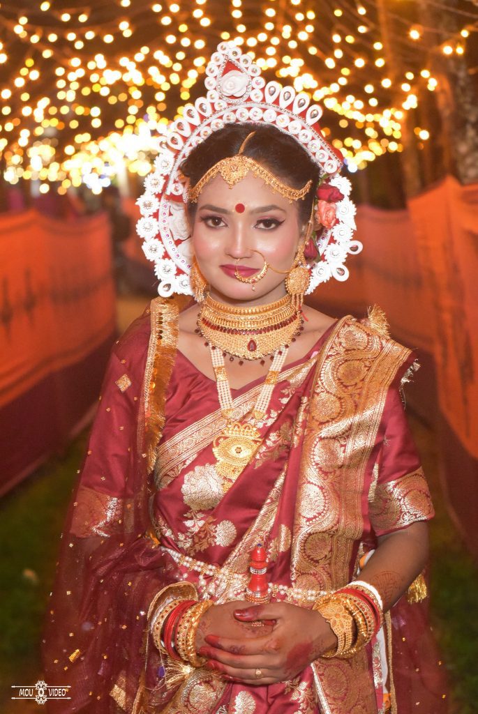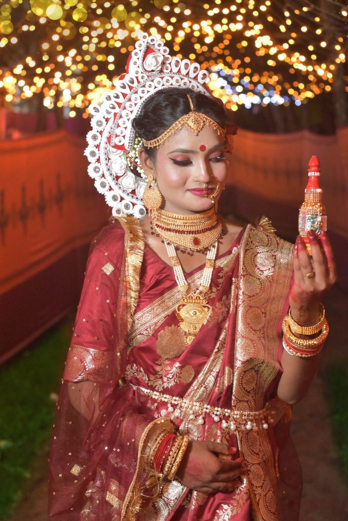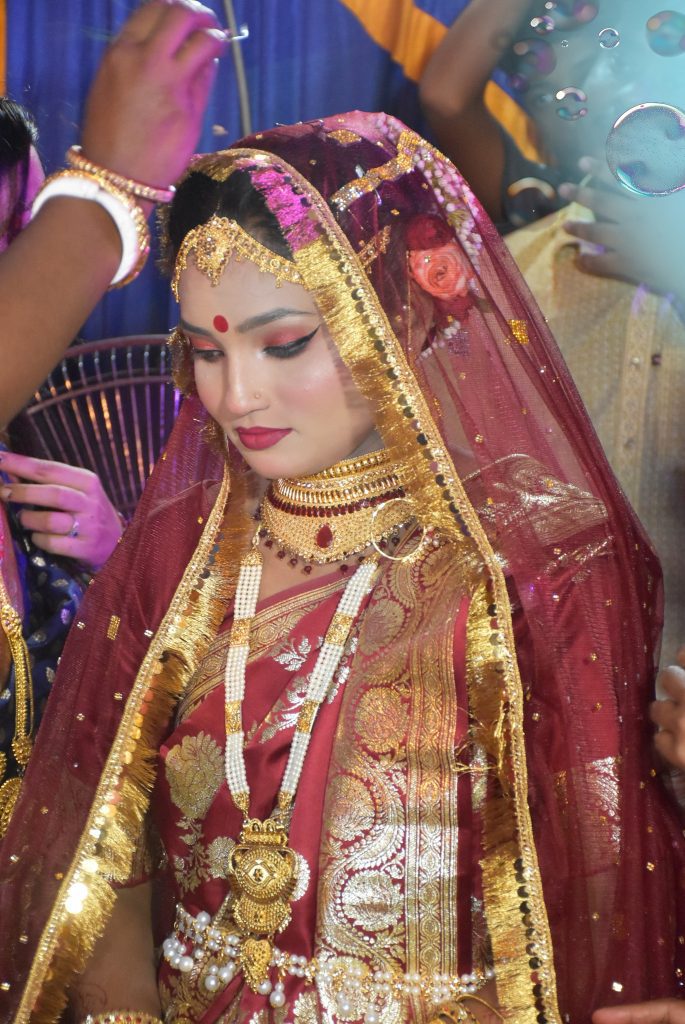 কনে রিংকি ঐতিহ্যবাহী লাল বেনারসিতে সেজে উঠেছিলেন অনবদ্যভাবে। মাথায় মুকুট–স্টাইলের সাদা টোপর, খোঁপায় ফুল, হাতে মেহেদির রঙ, আর গলায়-পায়ে গয়নার শোভা—সব মিলিয়ে তিনি ছিলেন নিখুঁত বাঙালি কনের প্রতিচ্ছবি। তাঁর চোখে ছিল একটু লাজুকতা, মুখে মিষ্টি হাসি, আর অভিব্যক্তিতে নতুন জীবনের উত্তেজনা। আলোর কোমল প্রতিফলন তাঁর মুখের ওপর পড়ছিল এমনভাবে, যেন প্রতিটি মুহূর্তই স্থির হয়ে যাচ্ছে চিরকালের জন্য।